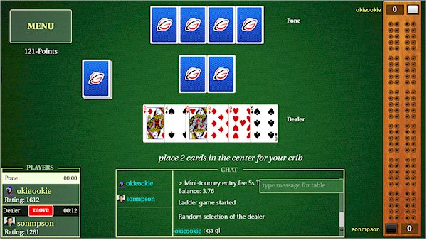 In the top-left corner of the game room, you can see your player account and your invitations. In the top right corner, you can see the scrollable game room chat. The main part of the game room screen shows players and their games. Open tables show 'Play' button. You can play, chat, watch other people play, select invitations, etc. The 'Menu' button is located in the very top left corner of the screen. Selecting a 'Menu' brings up a screen with actions that can be performed depending on the context. For example, if you are at a table watching a game, you can use the Menu to get out. You can use the 'Menu' in the game room to Create table, Exit a room, Look-up and change your player account information, etc. When you are playing or watching a game, a typical cribbage table looks like a picture below